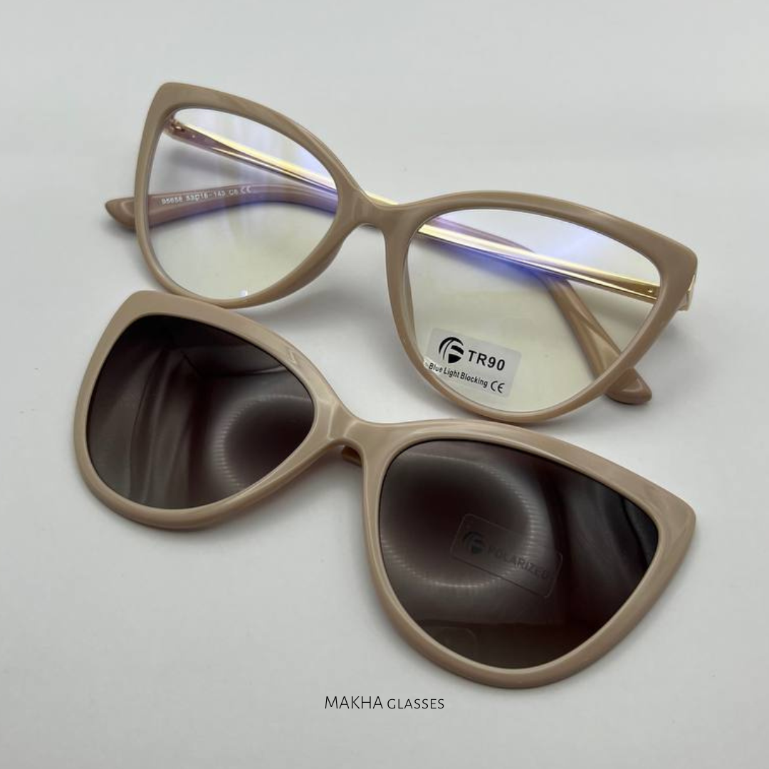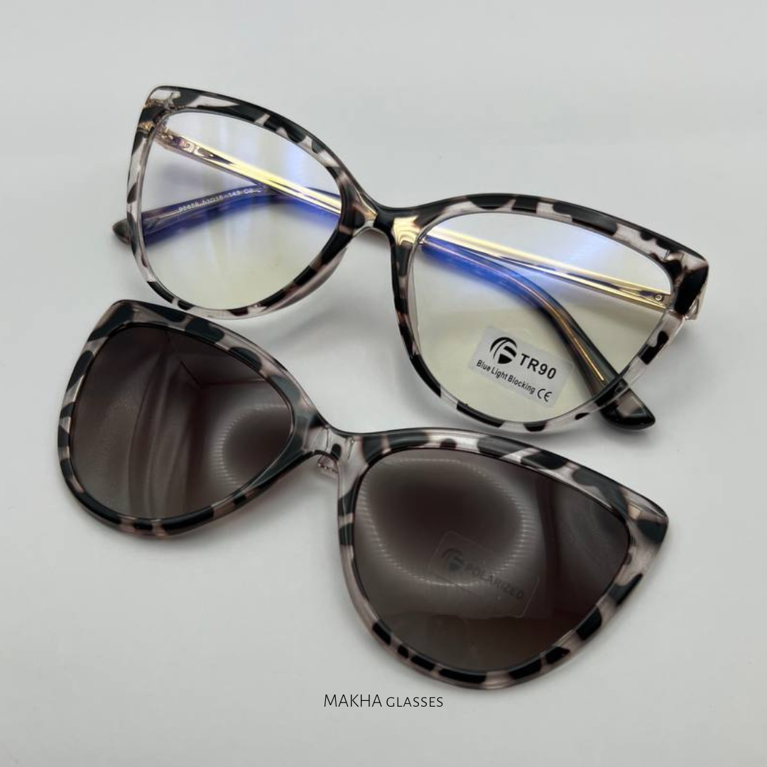 Kacamata Clip On 2in1 dengan model cat eye, ada perenggang dibagian sisi kanan dan sisi kiri. Bisa dijadiin frame, bisa juga dijadiin sunglasses.