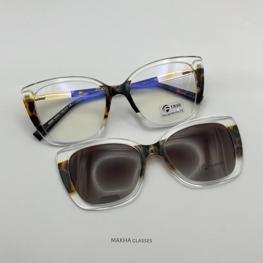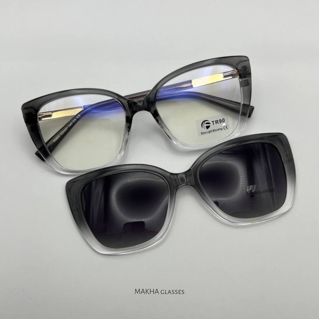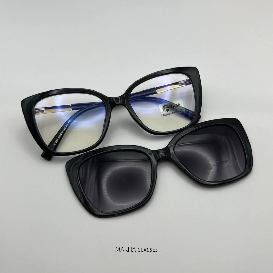 Kacamata Clip On 2in1 dengan model semi cat eye, ada perenggang dibagian sisi kanan dan sisi kiri. Bisa dijadiin frame, bisa juga dijadiin sunglasses.